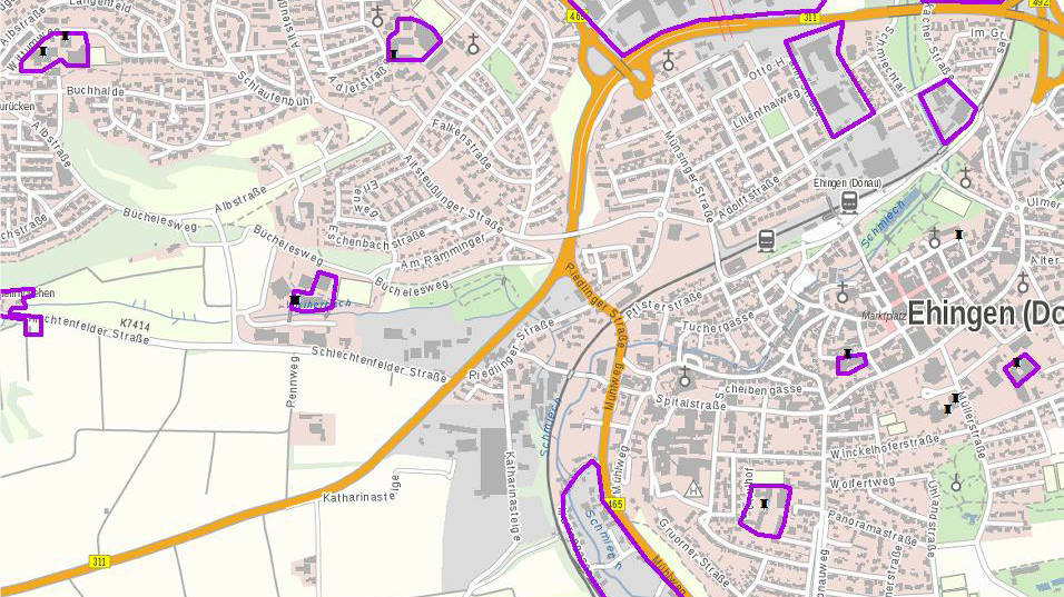 Die Ausbaugebiete im vorliegenden Antrag sind einige Schulstandorte in der Stadt Ehingen. Aufgrund der bisherigen, kommunalen Breitbandprojekte wie auch der Versorgungssituation von TK-Netzbetreibern befinden sich diese verstreut über das gesamte Gemarkungsgebiet Ehingen:
