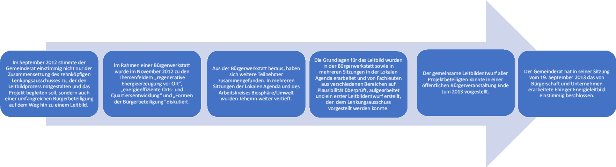 Im ersten Schritt wurde als Steuerungsgremium der Lenkungsausschuss am 13. Juni 2012 besetzt. Die NSED verfolgt seither die nachhaltige Weiterentwicklung der Stadt Ehingen. Zunächst wurde die Entwicklung eines Leitbildes mit den inhaltlichen Schwerpunkten Klimaschutz und Energie angestoßen. Das mittels intensiver Bürgerbeteiligung erarbeitete „Leitbild Klimaschutz und Energie“ wurde im Gemeinderat am 19. September 2013 beschlossen.